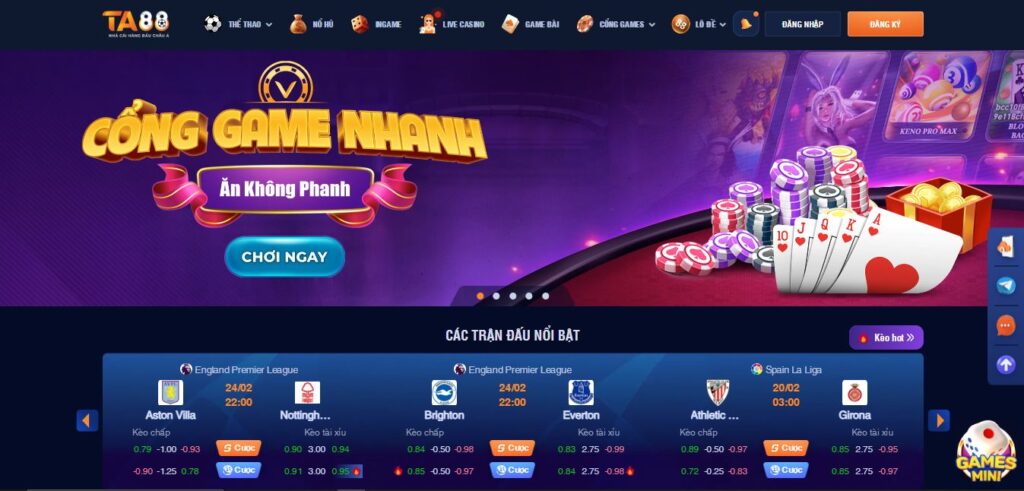 • Là nhà cái hàng đầu khu vực, Ta88 có kho trò chơi siêu đa dạng cùng tỷ lệ kèo cược cao, chất lượng